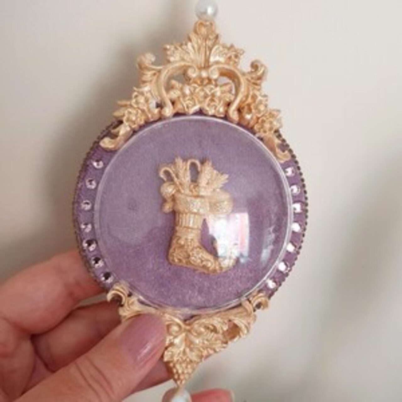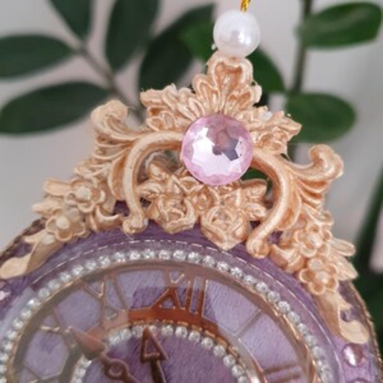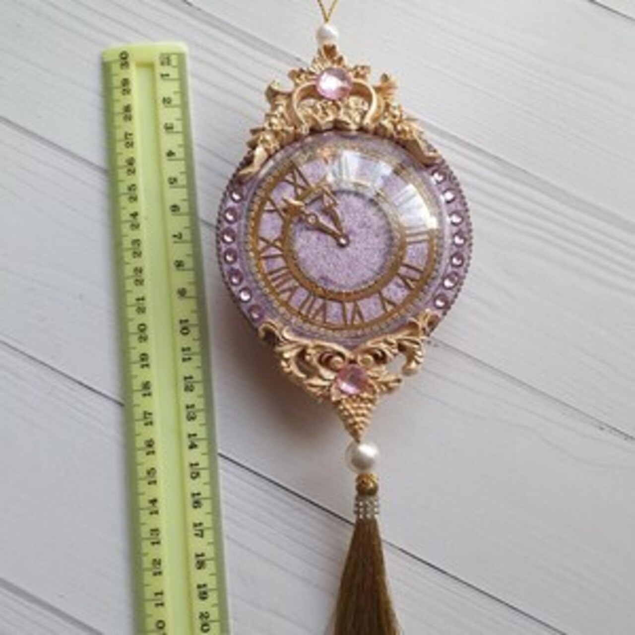 Exclusive handmade lilac Christmas clock ornament decorated with rhinestones and tassels
