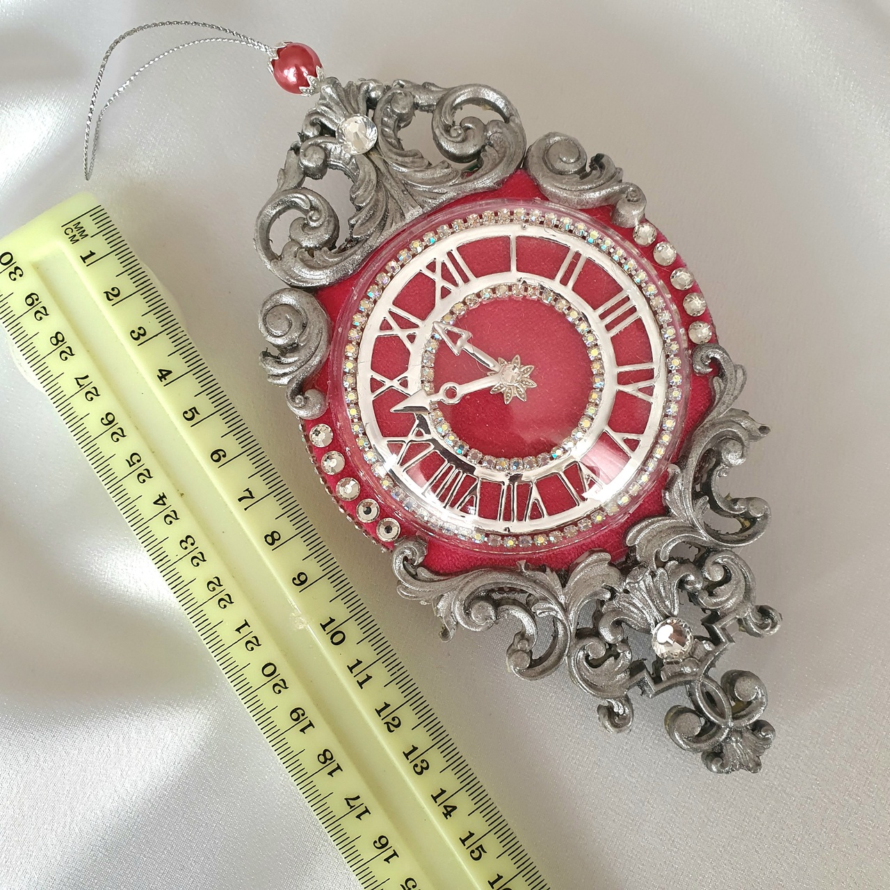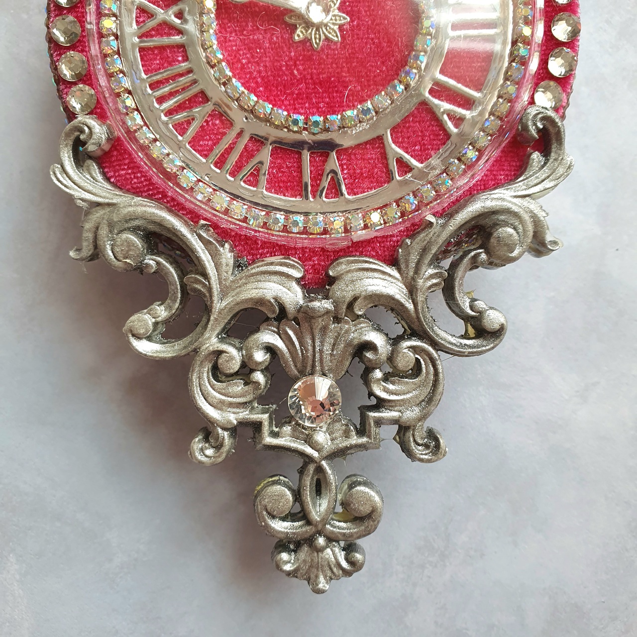 ✨ Bring warmth and romantic charm to your holiday décor with this rich, elegant clock-shaped ornament. The sturdy plastic base wraps in deep pink velvet, which reminds you of a muted holiday sunset.