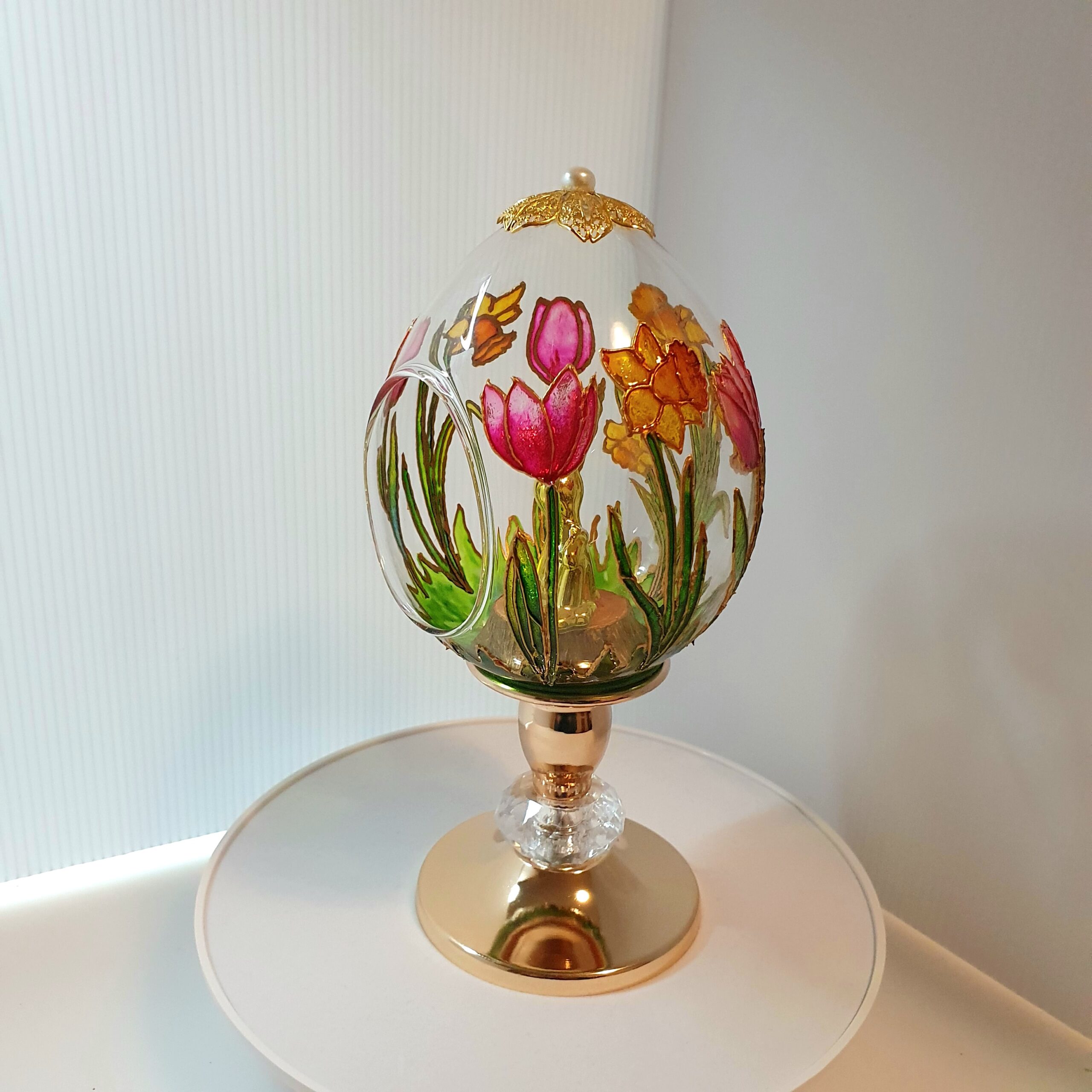 Hand-painted floral motifs decorate the glass surface. Bright tulips and soft yellow daffodils capture the freshness of spring. Furthermore, the stained-glass technique allows light to pass through the design, creating a gentle glow and enhancing the depth of color.