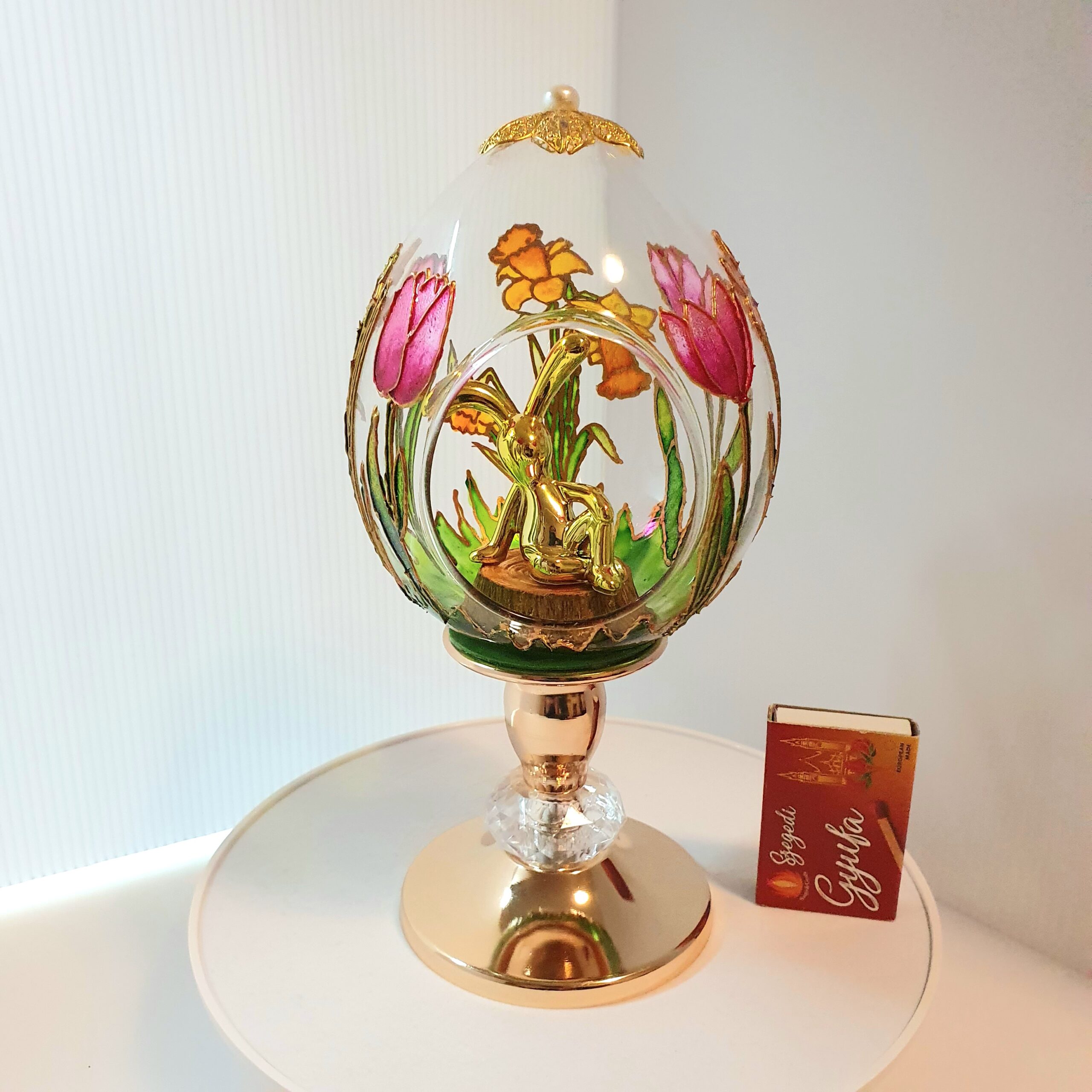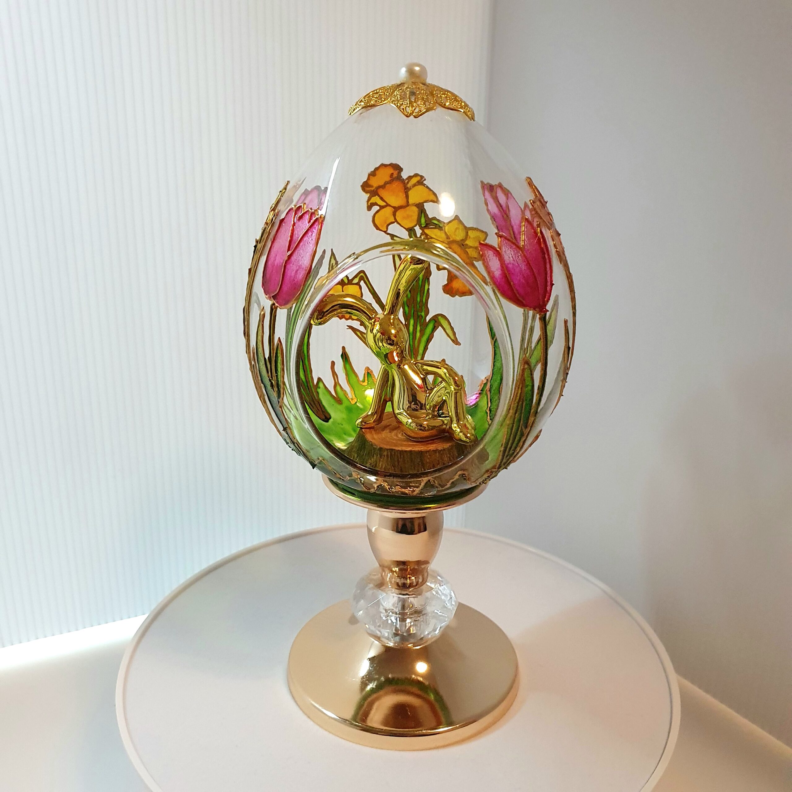 Celebrate the beauty of spring with this handmade glass Easter egg on a decorative stand. Not only does it bring light and color into a room, but it also adds seasonal charm.