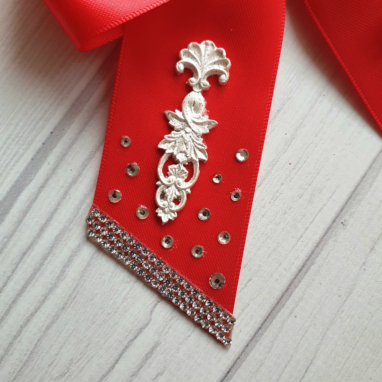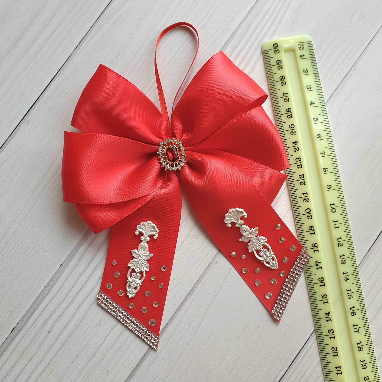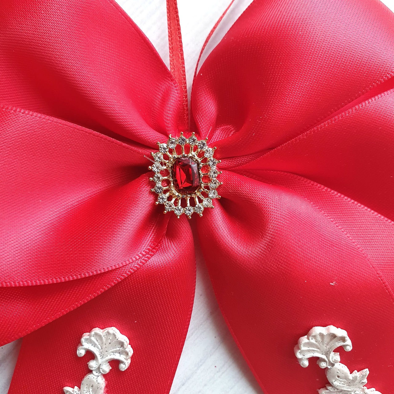 💎 The bows feature rich red silk ribbon, a timeless Christmas classic. Additionally, each bow includes a small brooch with a red gemstone in the center. Furthermore, bow tails have vintage-style embossing and sparkling rhinestones. Together, these details add a festive shimmer.